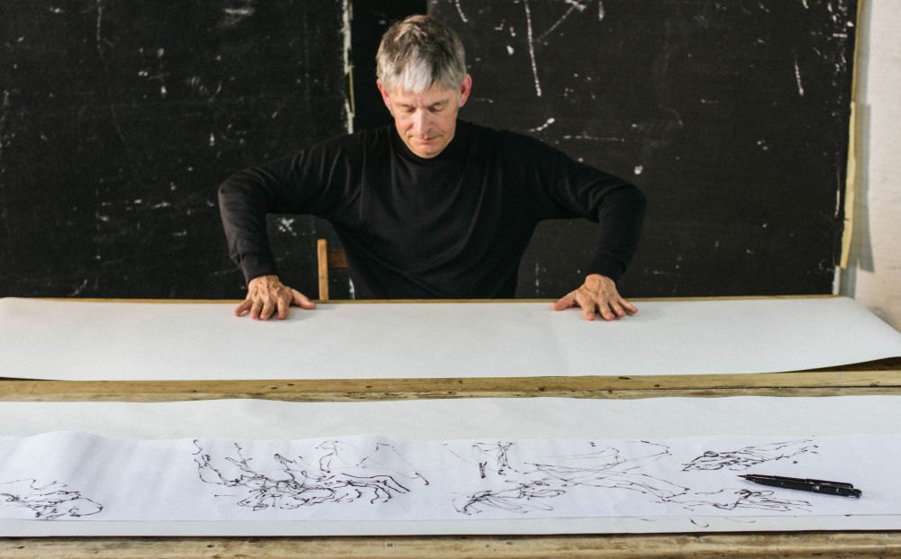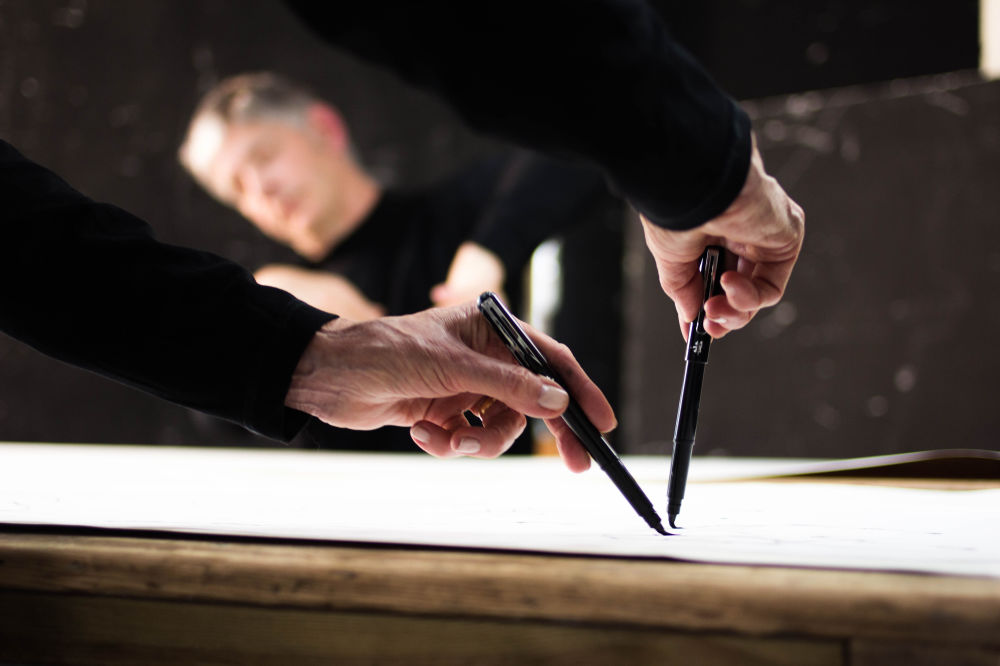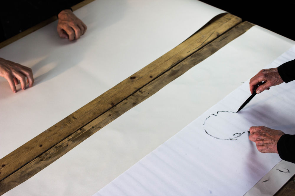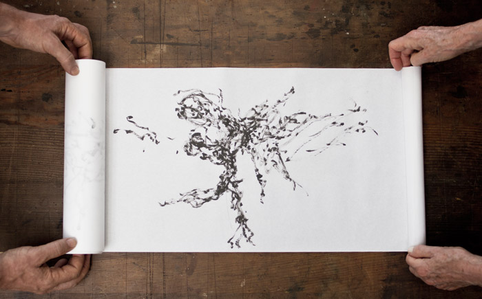 Through this project Andrew & Celia explore the dynamics of spontaneous gesture generated by music, sometimes shared, at others heard only by Andrew though headphones. Roman documents the dialogue creating a series of images that seek to bind the relationship between our hands, each other and the mark making notation made on scrolls.