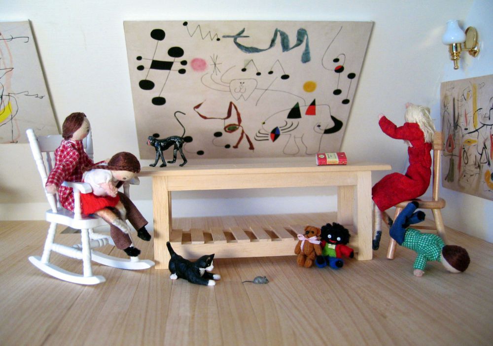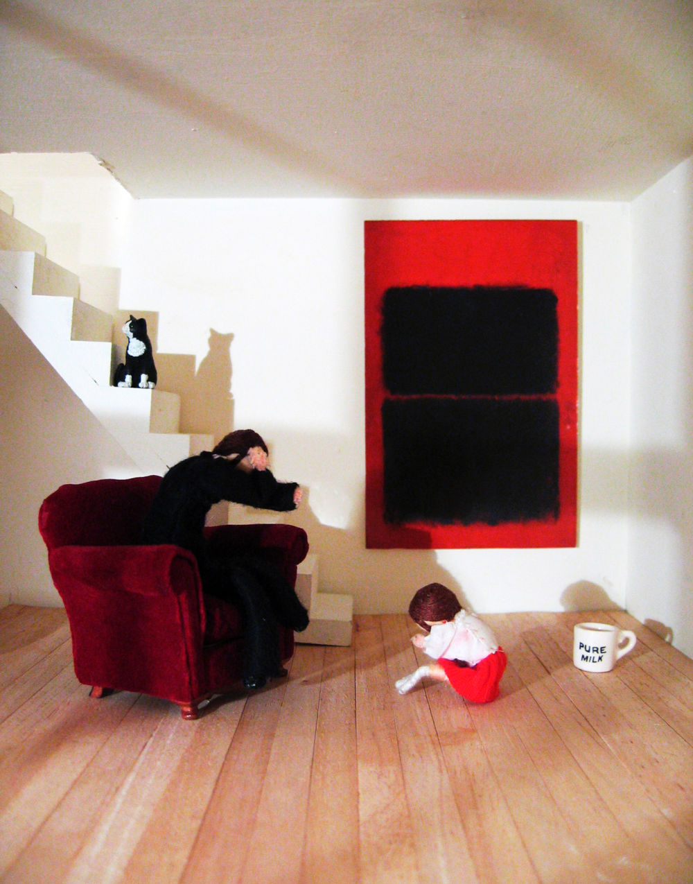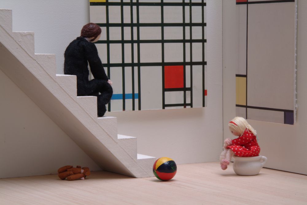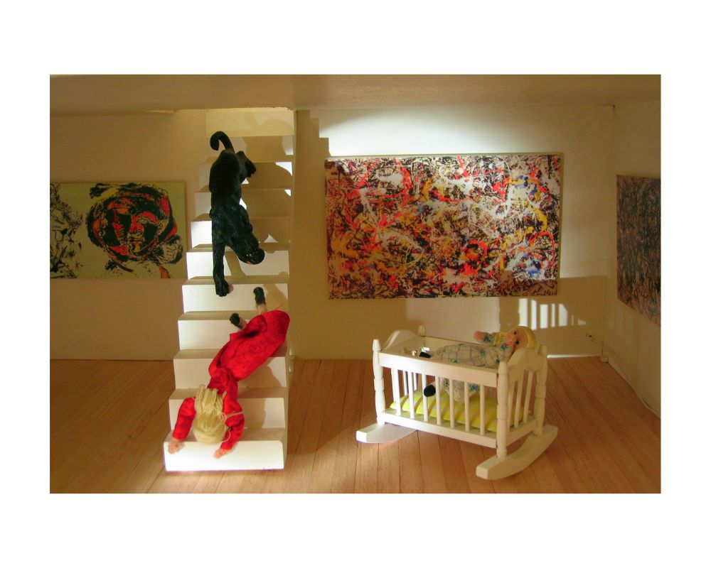Celia Read’s original and unsettling photographs are theatre pieces, psycho-dramas of childhood staged in a doll’s house where miniature figures with bodies made of pipe cleaners and cloth -- mostly in the shape of mother and daughter-- are discovered in mysterious and menacing scenes set against major works of modern art. The elegant world of adult play contrasts with and comments on the fierce world of child’s play going on around it.