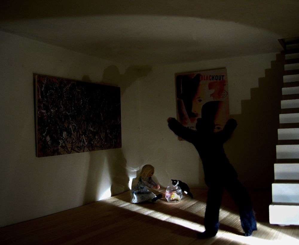 Read’s photos trap the fantastical dimension of childhood terror. The figures are small; the psychic events are huge. The effect of this juxtaposition is to create a child’s eye-view of the world, a sort of Beanstalk Country full of enormous and unfathomable events. Here, for instance, the shock of adult sex glimpsed in front of the fierce phallic shapes of a Franz Klein. In another photo, a father sits on the stairway slumped in front of a brooding Rothko while the daughter watches at a distance powerless to assuage his aura of doom. In these well-composed photographs, by pitting the child’s natural omnipotence against loss, Read creates the profound drama of childhood insecurity. In ‘Falling, falling, fallen’ for instance, the daughter is not strong enough to save her mother (or herself) from falling out a window. In Read’s fragile universe, the fear of annihilation lurks everywhere. In ‘When the cat was let out of the bag’ a black panther climbs down the stair-- the mother sprawls headlong before it--toward the crib where the terrified child lies. A long devouring shadow in ‘Stay in the light’ falls over the crepuscular gloom of the playroom in which a little girl watches her predatory cat gaze into a gold-fish bowl.
